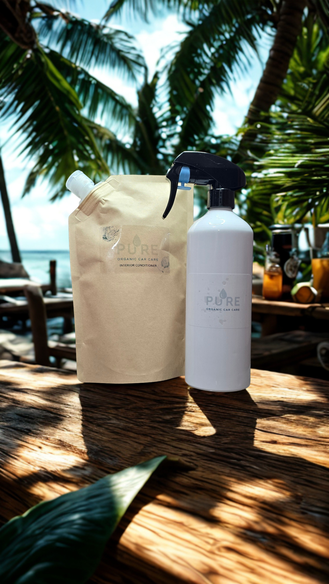 The PURE Kit includes our organic interior detailing spray plus our signature pure aluminum spray bottle—a sleek, reusable alternative to single-use plastic.